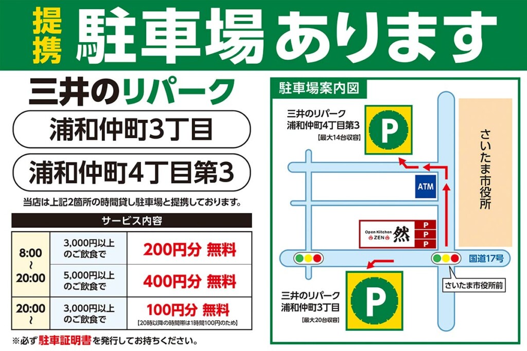 ※当店駐車場満車時は、提携駐車場に駐車していただき、必ず駐車証明書をお持ちください。