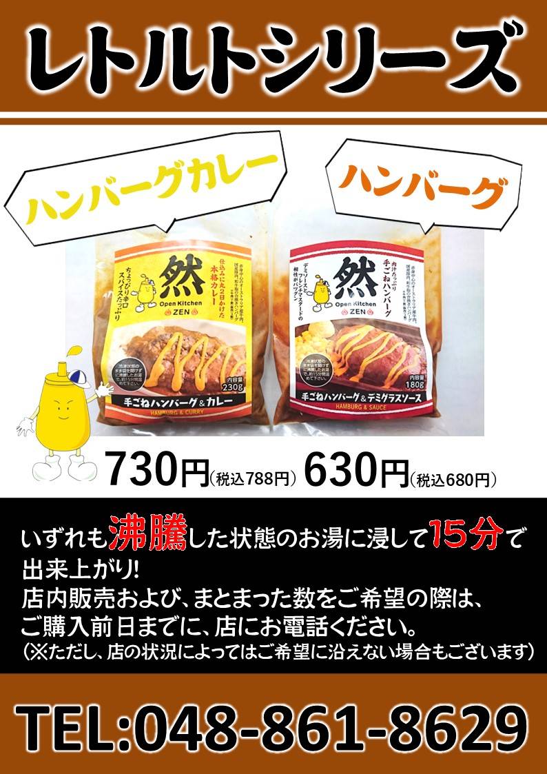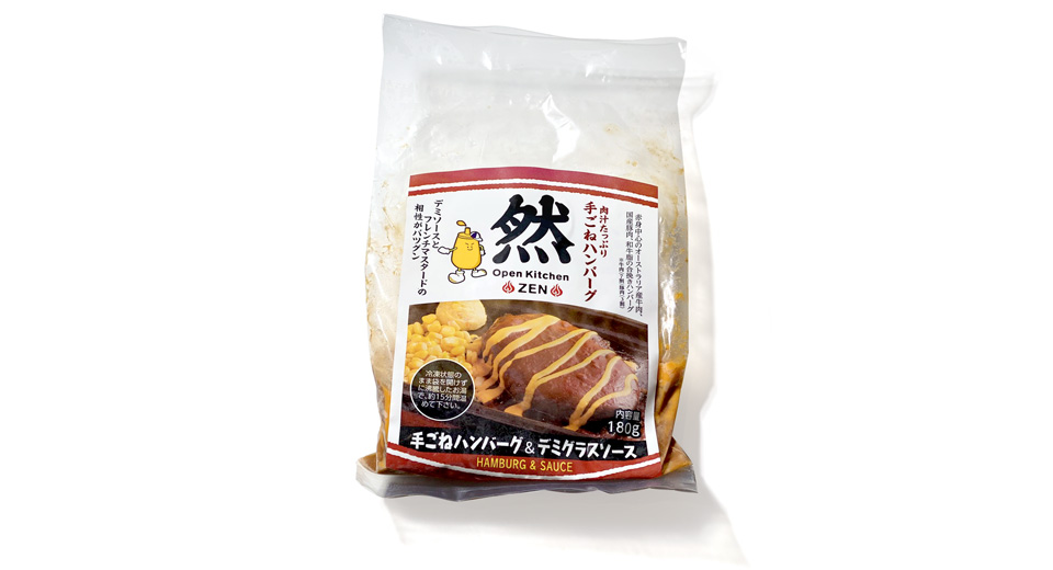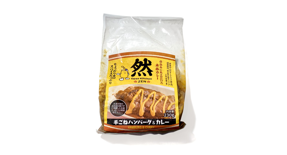 オープンキッチン然では、お持ち帰り用ハンバーグとハンバーグカレー(いずれも冷凍)を店内販売しています。
